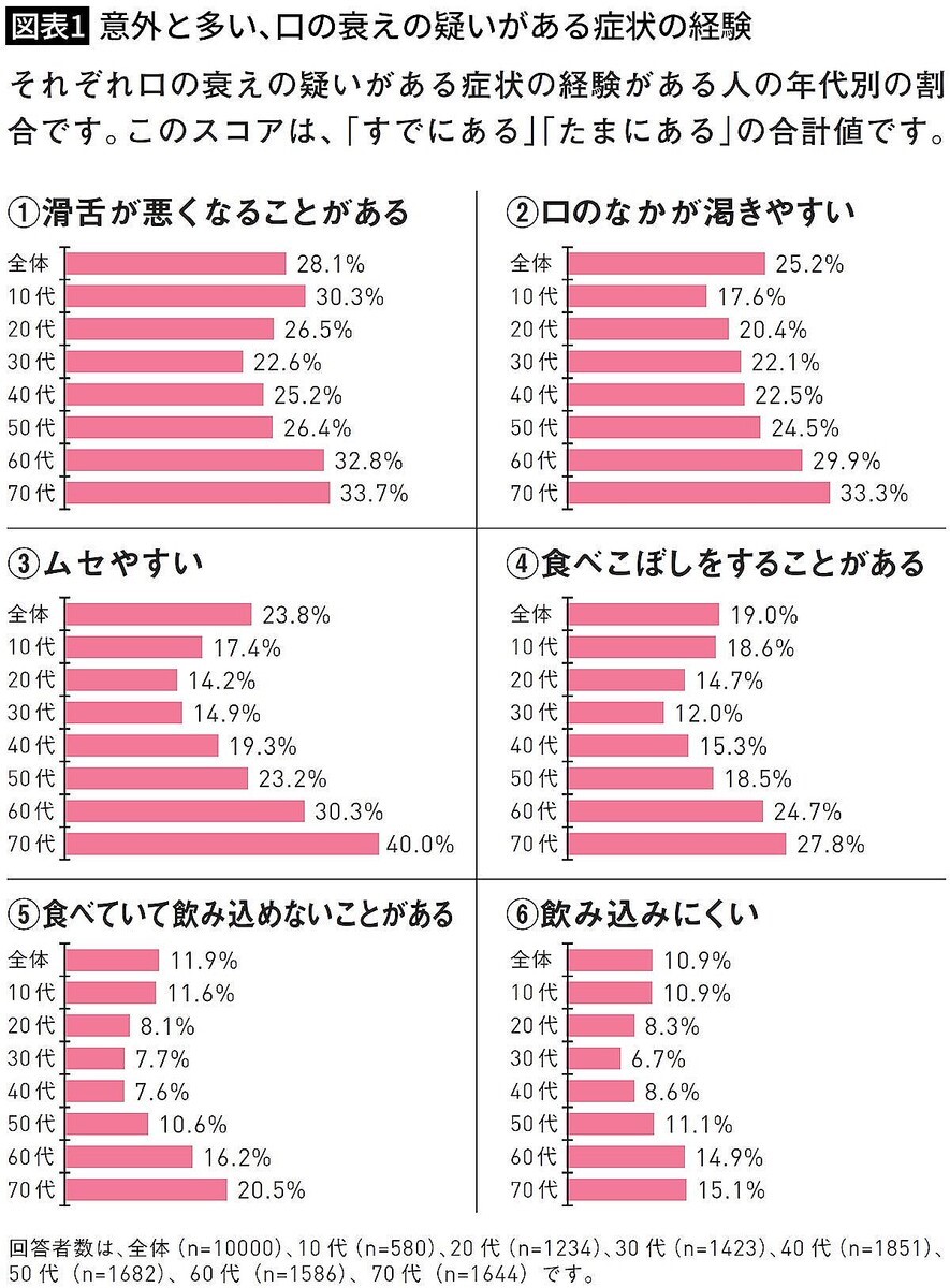 日本歯科医師会による、全国の15歳から79歳の男女1万人を対象に実施した「歯科医療に関する一般生活者意識調査」(2022年)の項目において、「滑舌が悪くなることがある」「ムセやすい」「食べこぼしをすることがある」など、口腔の機能不全が疑われる6つの症状を経験したことがあるかどうかを質問したものがあります。